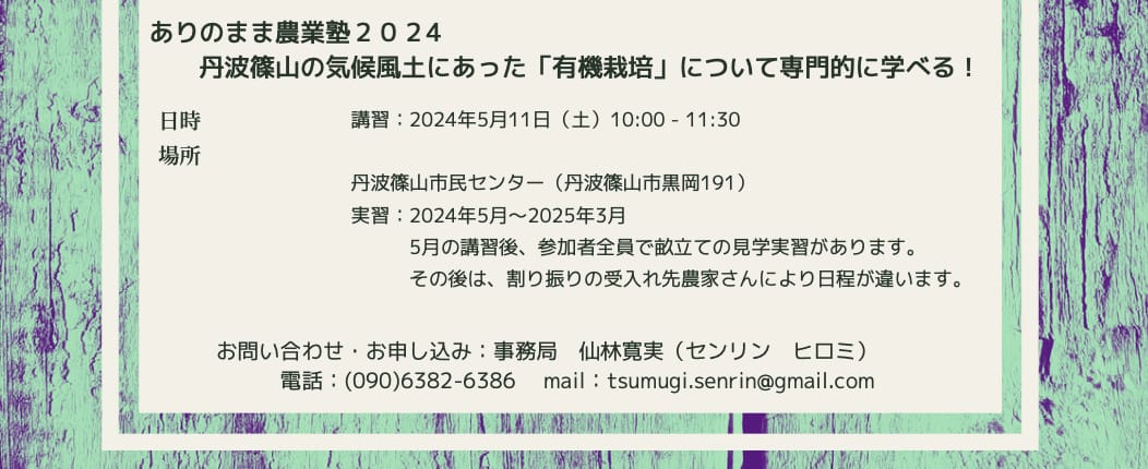 そんなみなさんに、丹波篠山市内で有機農家を営んでおられる皆さんのところで、実践的に学んでいただける農業塾です。