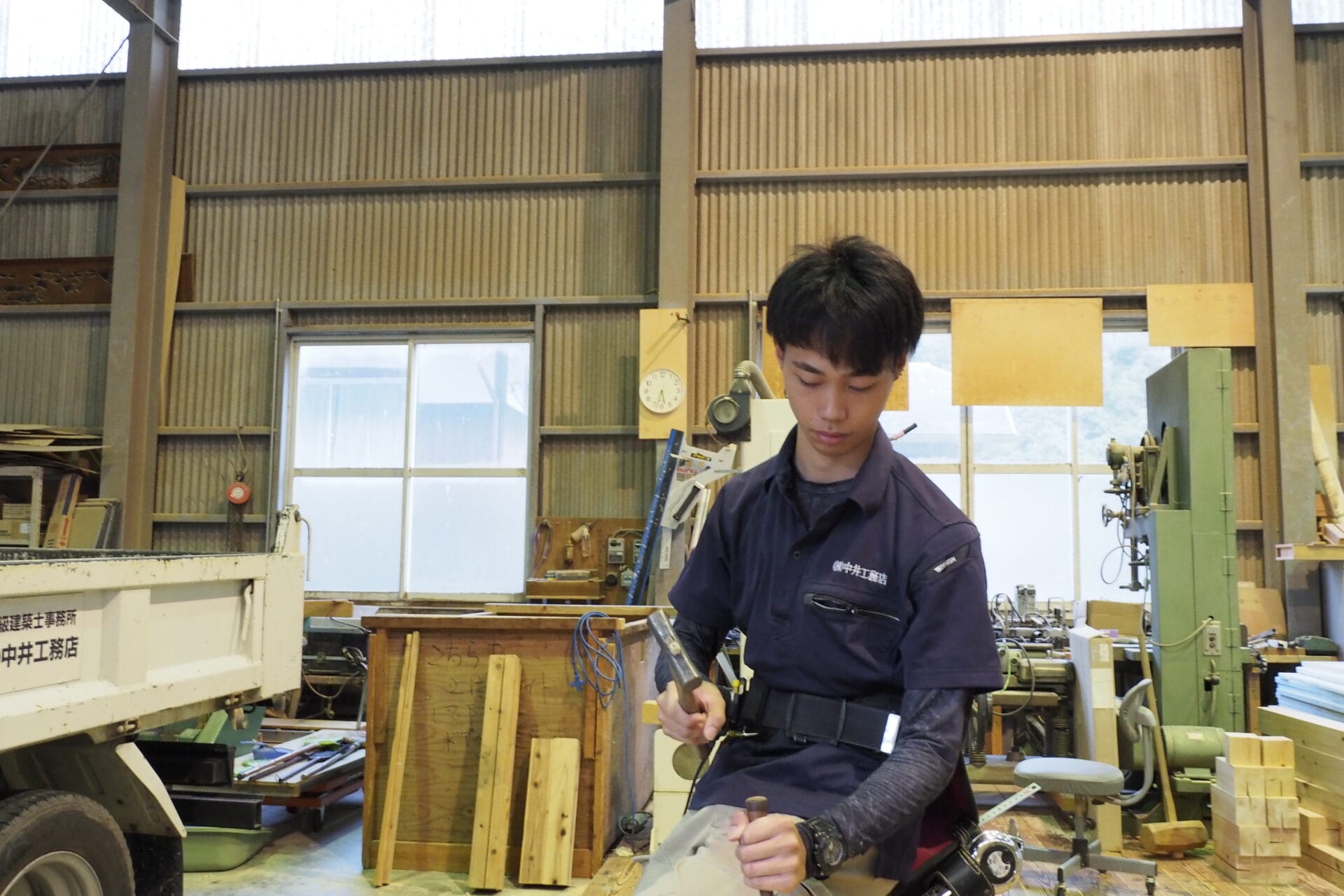 小学生の頃、家を建ててもらった経験から大工に憧れを持ちました。叔父も中井工務店で働いており、母が丹波篠山出身だったこともあって、現在は市内の会社寮で一人暮らしをしています。今はまだまだ覚えることが多いですが、先輩大工の方々から技術を学びながら、将来的には現場を任せてもらえる大工を目指しています。