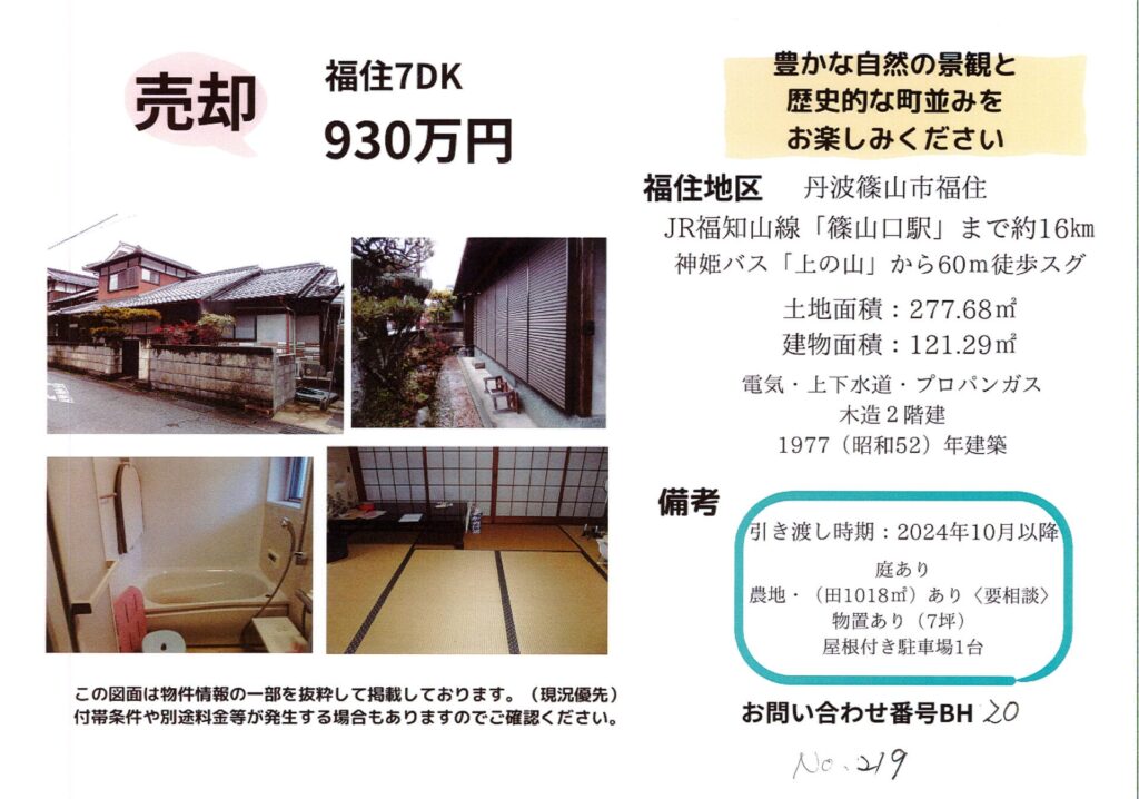 | 特記事項 | 引き渡し時期:2024年10月以降・農地(田1018㎡)あり要相談・物置あり(7坪)・屋根付き駐車場1台あり | ||