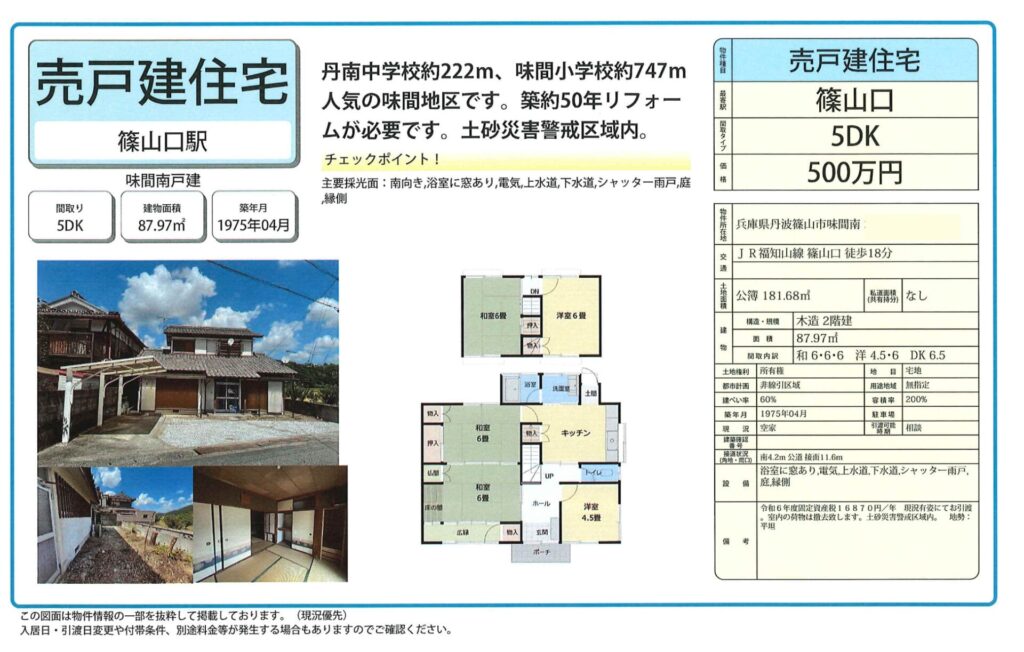 | 特記事項 | ・令和6年度間定資産税16870円/年・現況有姿にてお引渡 ・室内の荷物は撤去致します。土砂災害警戒区域内。 地勢:平坦 | ||