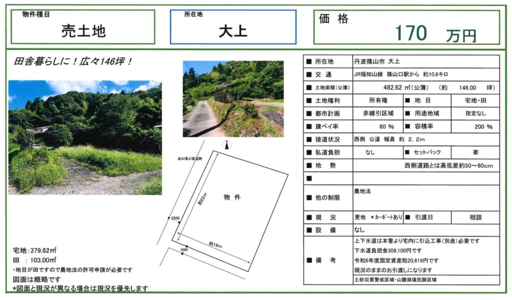 | 特記事項 | 宅地:379.62m 田:103.00m ・地目が田ですので農地法の許可申請が必要です。上下水道は本管より宅内に引込工事(別途)必要です 下水道負担金309,100円です 令和6年度固定資産税20,619円です 現況のままのお引渡しになります 土砂災害菩戒区域・山腹崩壊危険区域 | ||