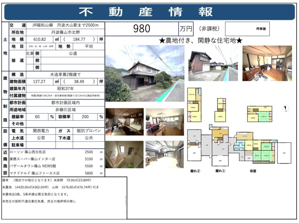 | 特記事項 | 物置2階建て84.29m・居宅兼車庫2階建て107.24m(公課証明参照)・農地あり | ||