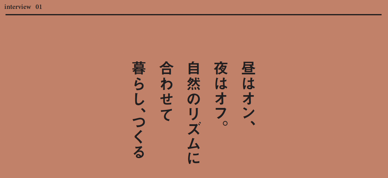 一緒に田舎暮らしを楽しみましょう。 自然と足並みを揃え、 暮らしと制作のリズムを整える。 移住したら、やりたいことばかりに。 昼はオン、 夜はオフ。 自然のリズムに 合わせて 暮らし、つくる