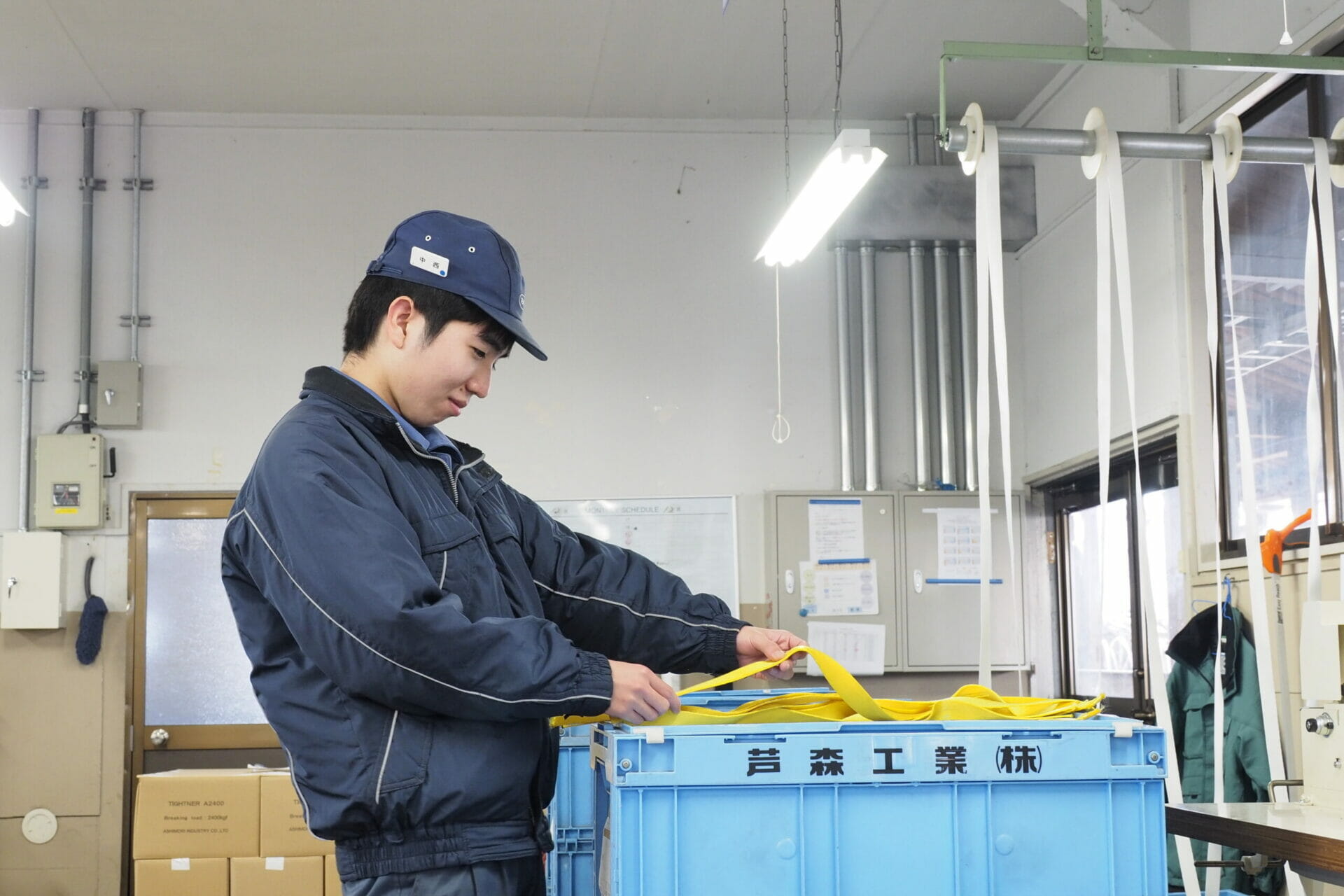 最初はベルトを切断する仕事を担当していましたが、今は織物の機械を担当しています。機械が海外製なので日本語の表記などがなく、メンテナンスや故障のときが大変です。周りの先輩たちに教わりながら対応しています。
