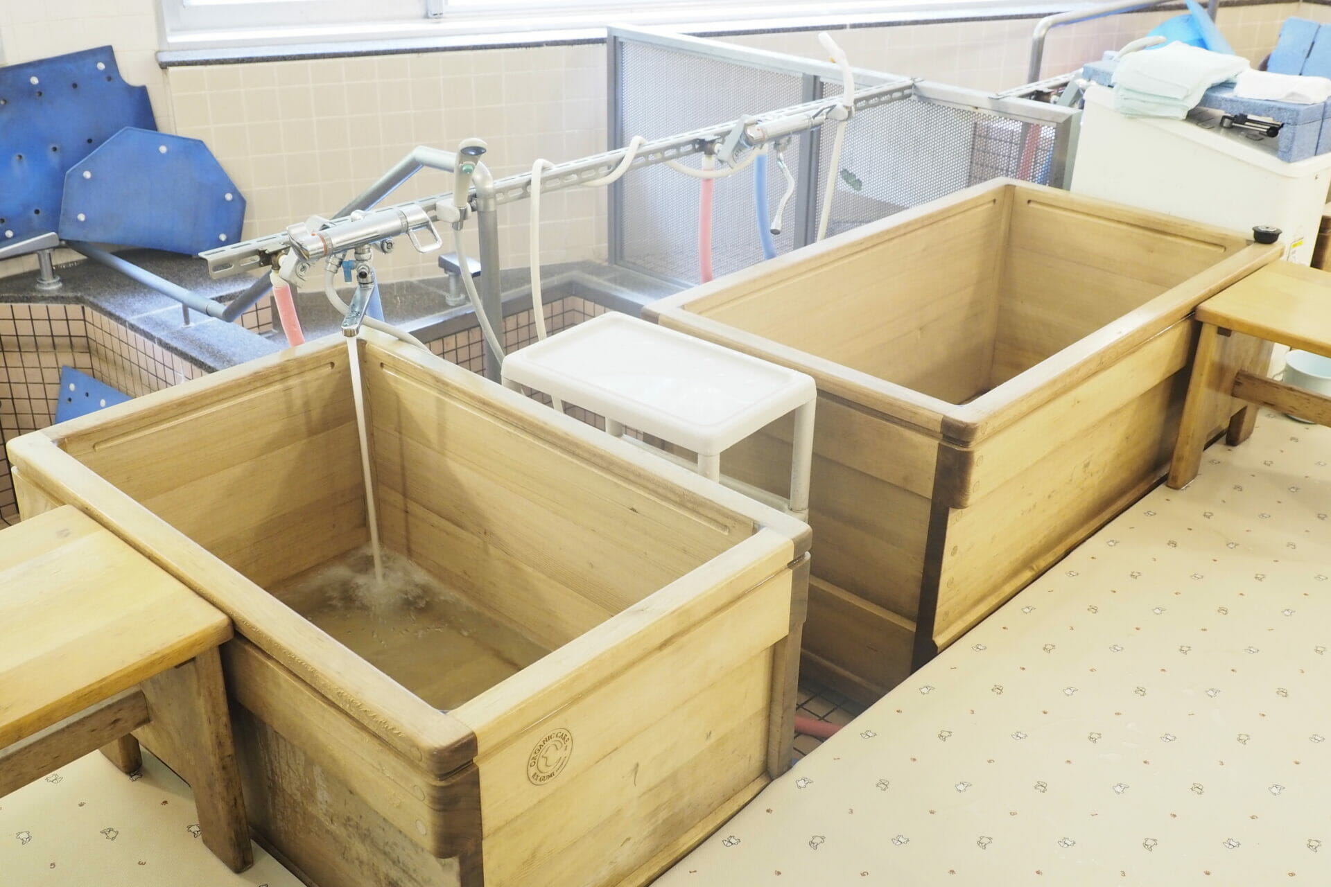 首藤さん:「一昨年よりケアプロデュースRX組の青山様に携わっていただき、機械浴ではなくヒバの木を活用したお風呂での個浴を導入しています。利用者さんに生活の一環としてお風呂を楽しんでほしいと思い、導入しました。」